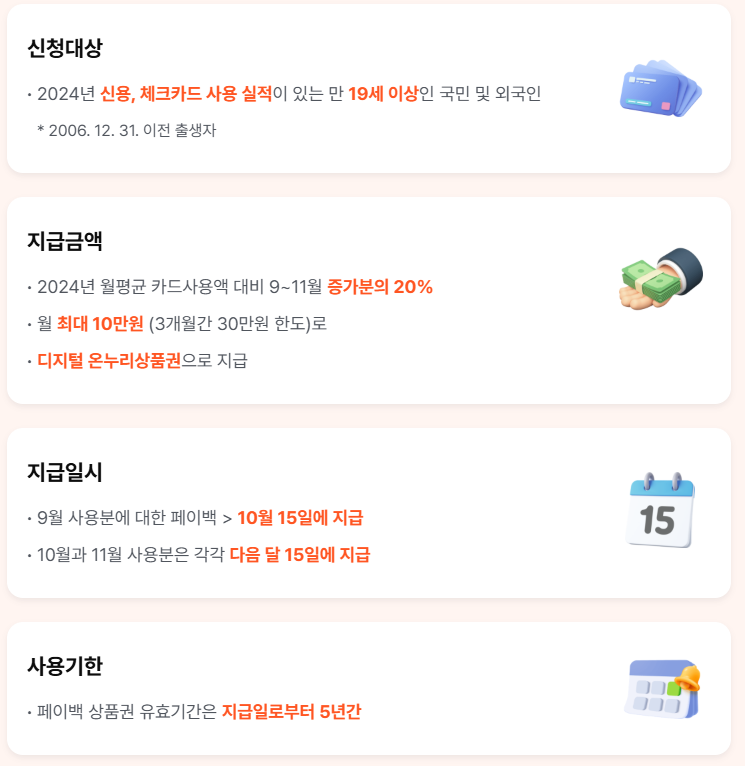 예시: 2024년 월평균 카드 소비액이 100만 원이었는데, 2025년 10월 카드 소비액이 130만 원이라면 증가분 30만 원의 20%인 6만 원을 환급받을 수 있습니다.